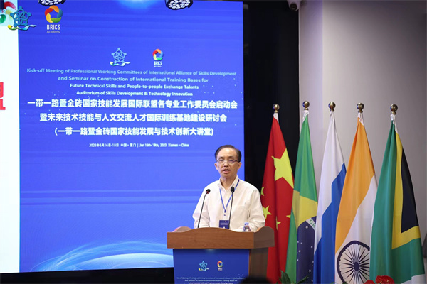 近日,一帶一路暨金磚國家技能發(fā)展國際聯(lián)盟各專業(yè)工作委員會啟動會暨未來技術技能與人文交流人才國際訓練基地建設研討會在廈門成功舉辦。教育部中外人文交流中心副主任夏娟,一帶一路暨金磚國家技能發(fā)展國際聯(lián)盟理事長、廈門市金磚未來技能發(fā)展與技術創(chuàng)新研究院院長劉振英出席會議并致辭。廈門市教育局副局長洪軍、廈門市人社局副局長彭新良、教育部中外人文交流中心機制工作二處處長陳滔偉、廈門市教育局高教職教處處長陳哲新、中國交通教育研究會副會長楊澤宇、教育部中外人文交流中心機制工作二處張馨心、廈門市金磚辦代表沈麗瓊、廈門火炬管委會代表蔡坤海、廈門市集美區(qū)人民政府代表于淑雅出席會議。來自全國82所院校、18家企業(yè)和社會團體的200多名領導和專家現(xiàn)場參會。