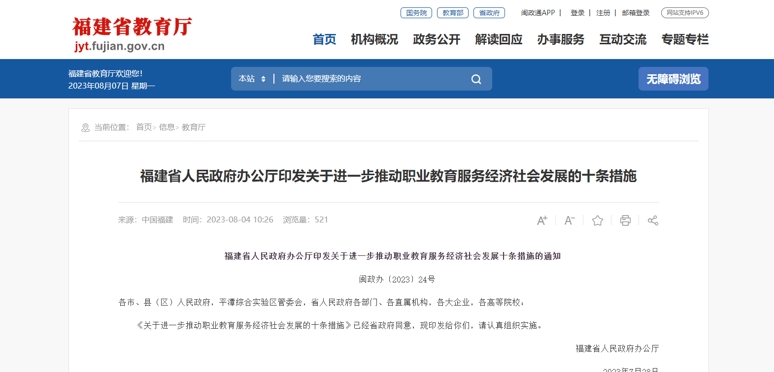 為深入學(xué)習(xí)貫徹黨的二十大精神和習(xí)近平總書記關(guān)于職業(yè)教育的重要指示精神,深入落實(shí)全國職業(yè)教育大會部署,根據(jù)中共中央辦公廳、國務(wù)院辦公廳印發(fā)《關(guān)于深化現(xiàn)代職業(yè)教育體系建設(shè)改革的意見》,按照聚焦全省高質(zhì)量發(fā)展現(xiàn)實(shí)需求,深化產(chǎn)教融合、校企合作,促進(jìn)教育鏈、人才鏈與產(chǎn)業(yè)鏈、創(chuàng)新鏈銜接的要求,結(jié)合我省經(jīng)濟(jì)社會發(fā)展對職業(yè)教育高質(zhì)量人才培養(yǎng)的迫切期盼,深入推進(jìn)福建特色現(xiàn)代職業(yè)教育體系建設(shè),提出以下十條措施。
