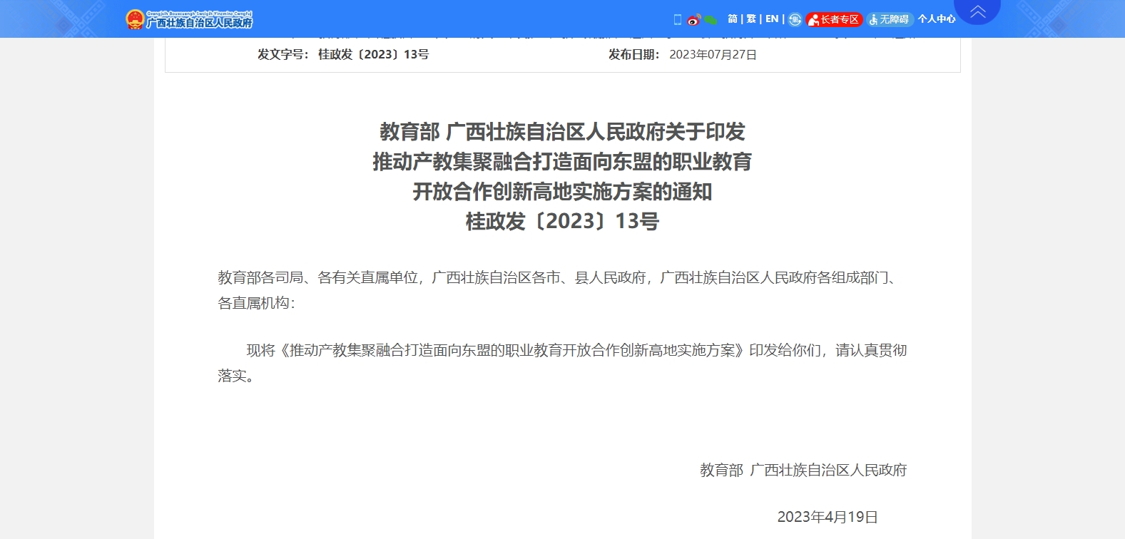 教育部 廣西壯族自治區(qū)人民政府關(guān)于印發(fā)推動產(chǎn)教集聚融合打造面向東盟的職業(yè)教育開放合作創(chuàng)新高地實(shí)施方案的通知桂政發(fā)〔2023〕13號