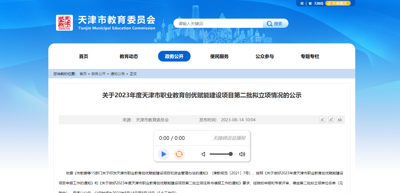 8月14日,天津市教育委員會在其官網(wǎng)發(fā)布《關于2023年度天津市職業(yè)教育創(chuàng)優(yōu)賦能建設項目第二批擬立項情況的公示》,依據(jù)《市教委等15部門關于印發(fā)天津市職業(yè)教育創(chuàng)優(yōu)賦能建設項目和資金管理辦法的通知》(津......