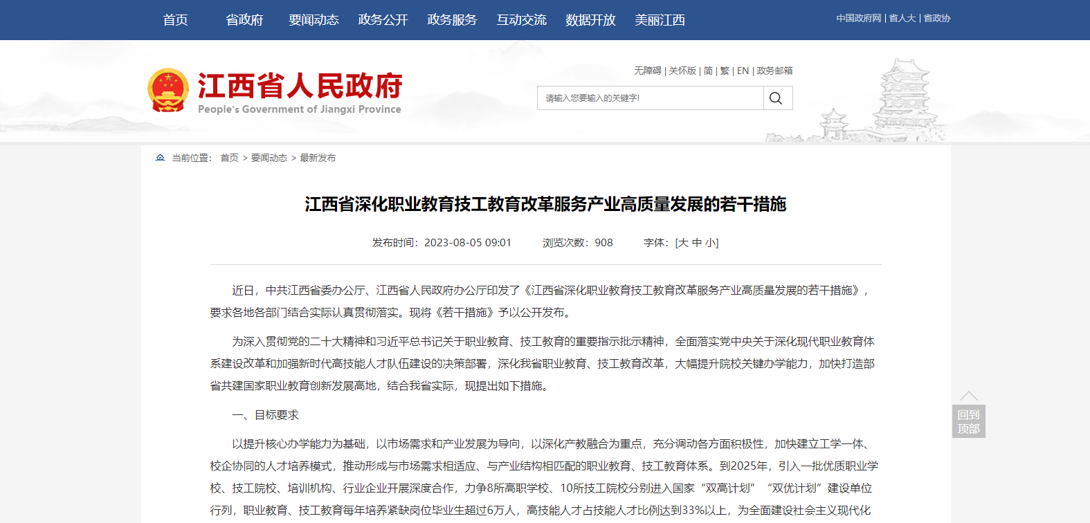 江西省發(fā)布深化職業(yè)教育技工教育改革服務產(chǎn)業(yè)高質量發(fā)展的若干措施