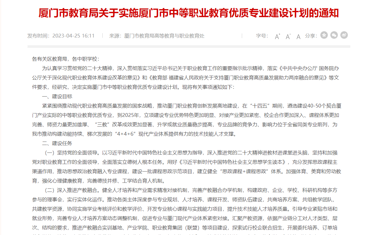廈門市教育局發(fā)布關于實施廈門市中等職業(yè)教育優(yōu)質(zhì)專業(yè)建設計劃的通知